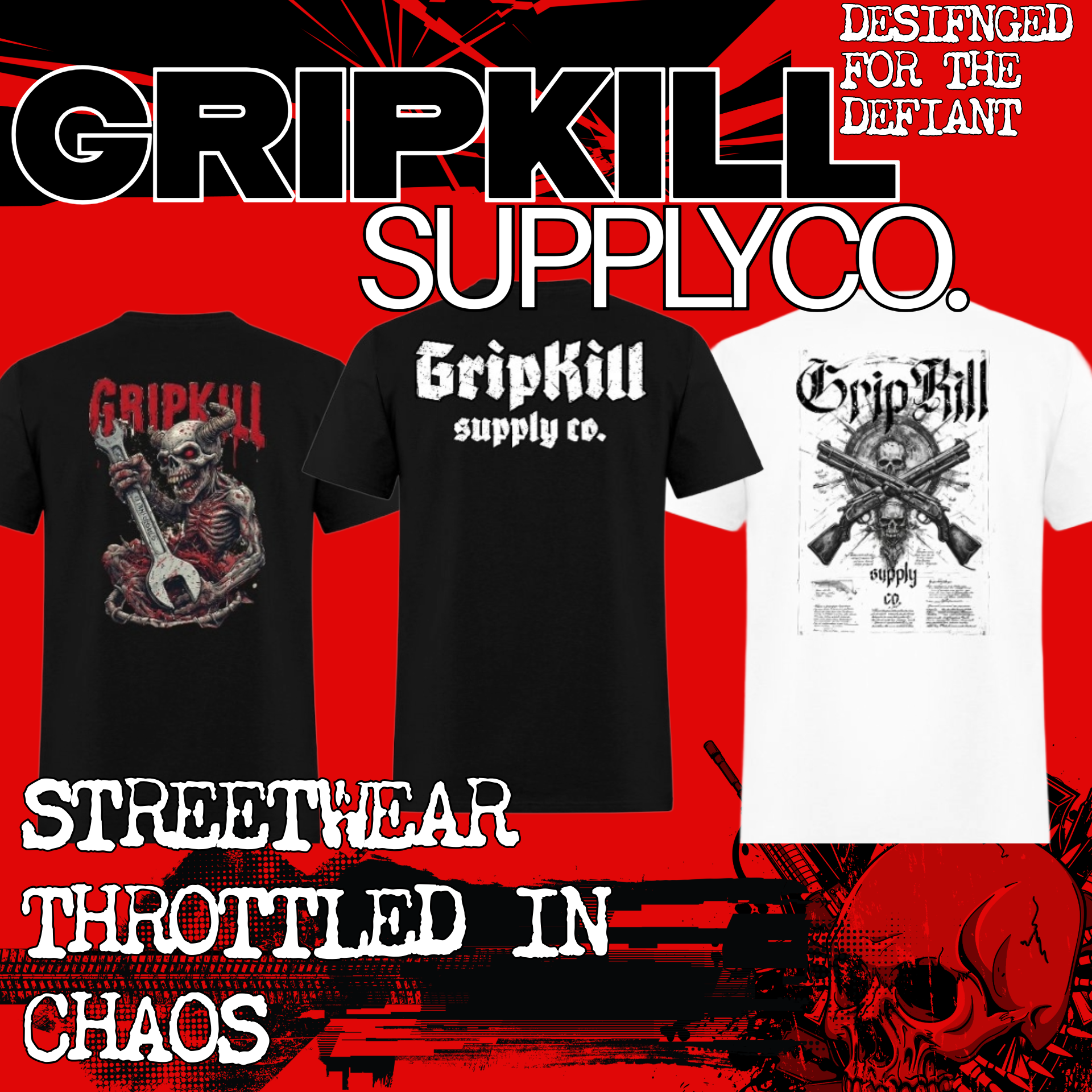 GripKill Supply Co. started as a middle finger to safe, boring motorcycle merch. Seth Ramirez built it out of pure throttle culture. Late nights, loud engines, street bikes screaming through empty roads, and the kind of adrenaline that only shows up when you twist the grip and stop giving a damn about playing it safe. GripKill was never meant to be polished or corporate. It came from the rider mindset—grip the bars, kill hesitation, ride like hell and let the road sort out the rest. Texas Blood Money Media handled the visual violence behind it. TXBMM built the graphics, the attitude, and the look that made GripKill feel like it belonged in the wild instead of a mall rack. Hardline artwork, aggressive merch concepts, and branding that actually matched the energy of people who live fast and don’t ask permission. It wasn’t about selling t-shirts. It was about putting a symbol on the backs of riders who already knew exactly what the hell it meant.